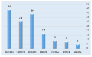 شكل (4): توزيع عدد حالات قتل الصحفيين خلال شهور الحرب على غزة(7 أكتوبر/تشرين الأول 2023 – 29 أبريل/نيسان 2024)